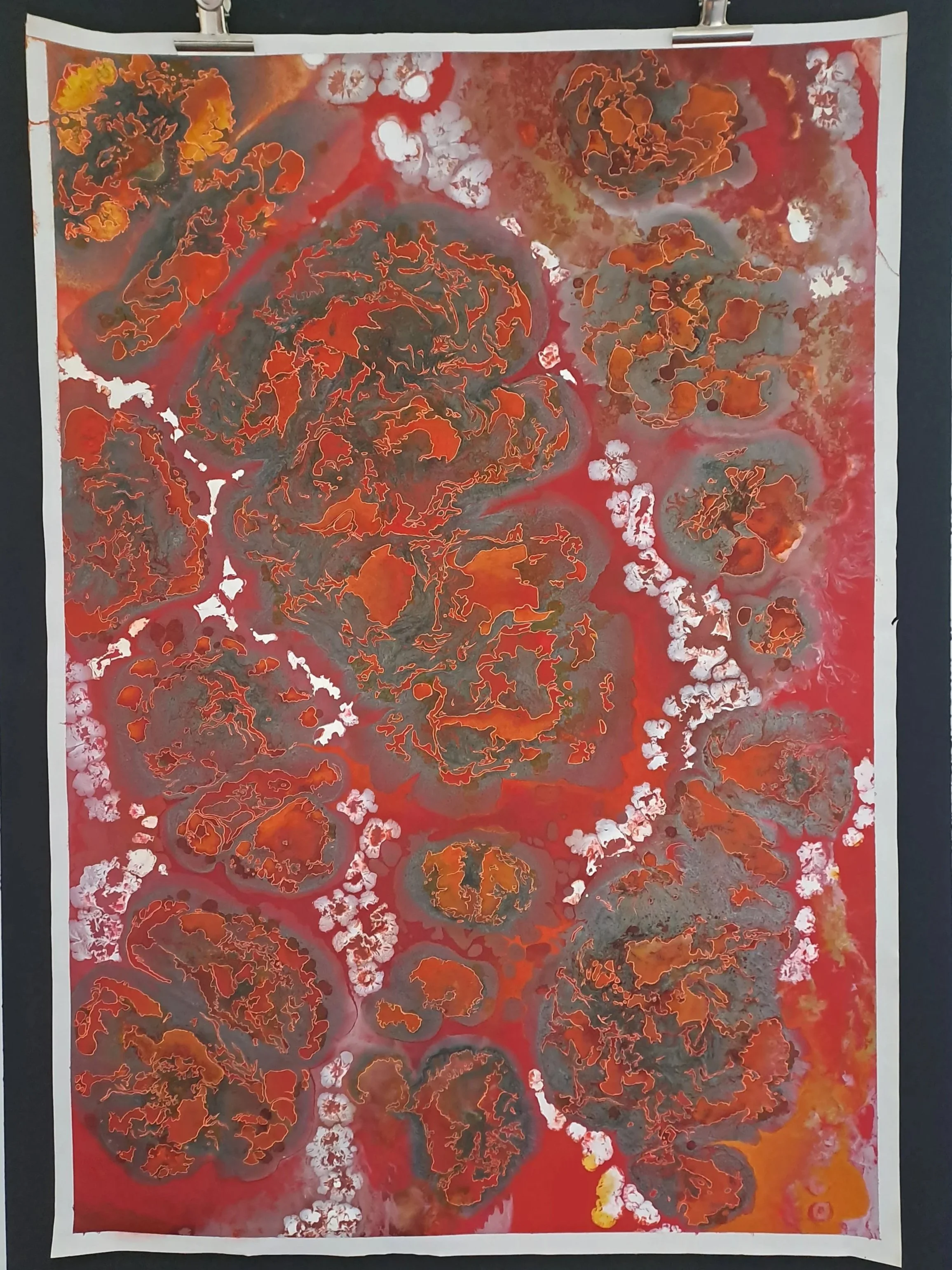 Diese Serie widmet sich Prozessen des Werdens und der Verwandlung. Aus dem Zusammenspiel von Acrylfarbe, Alcohol Ink, Lack und zeichnerischen Eingriffen entstehen organisch anmutende Strukturen, die an Zellen, Gewebe, mikroskopische Landschaften oder innere topografische Räume erinnern. Die Arbeiten bewegen sich zwischen freiem Materialprozess und bewusstem Eingriff. Fließende, spontan entstehende Formationen werden durch Fine-Liner, Schattierungen und Highlights weiterentwickelt, präzisiert und in ihrer Tiefe hervorgehoben.